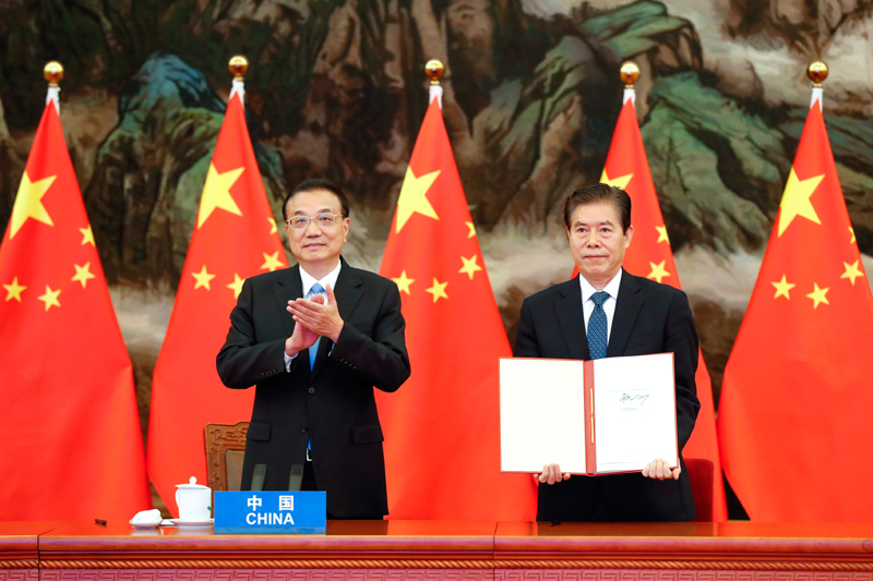 12:54,在李克强总理的见证下,商务部长钟山代表中国在协定上签字。相隔万里的其他分会场上,不同国家的领导人一起鼓掌致意。