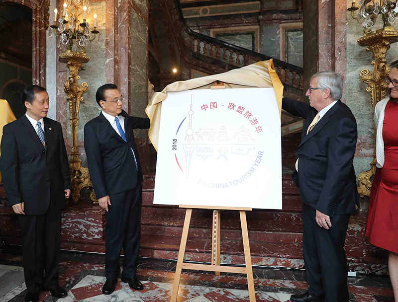 当地时间2日上午,李克强总理与欧盟委员会主席容克在布鲁塞尔的埃格蒙宫,共同为中欧“旅游年”和中欧“蓝色年”标识揭牌。经双方商定,2017年为中欧“蓝色年”,双方将深化海洋领域研究合作,2018年则为中欧“旅游年”。