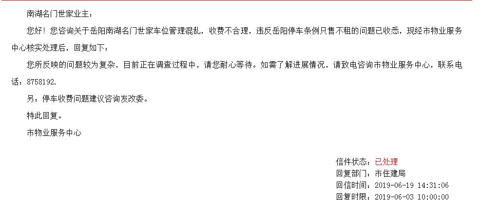 您好,我是岳阳南湖名门世家小区普通业主,我于3月前投诉,岳阳南湖名门世家违反最新颁布的《岳阳市机动车停车条例》只租不售规定,后发改委、物业公司等部门均有回复,可是各部门并没有解决问题,最后各部门回应均在处理,且小区业主委员会组织与开发商沟通车位出租问题,开发商推诿责任拖延时间,导致《岳阳市机动车停车条例》形同虚设。名门世家小区,在商业区,小区无地上车位,均为地下人防车位,可是开发商与各部门均在打圆场,无部门负责督促开发商落实管理条例。现政府制定了符合老百姓需要的政策与法律,可是在没有落实到普通老百姓身上,希望领导能督促开发商对小区业主合理价格开放出租车位,避免小区业主入住后与开发商矛盾激化,出现不理智维权。