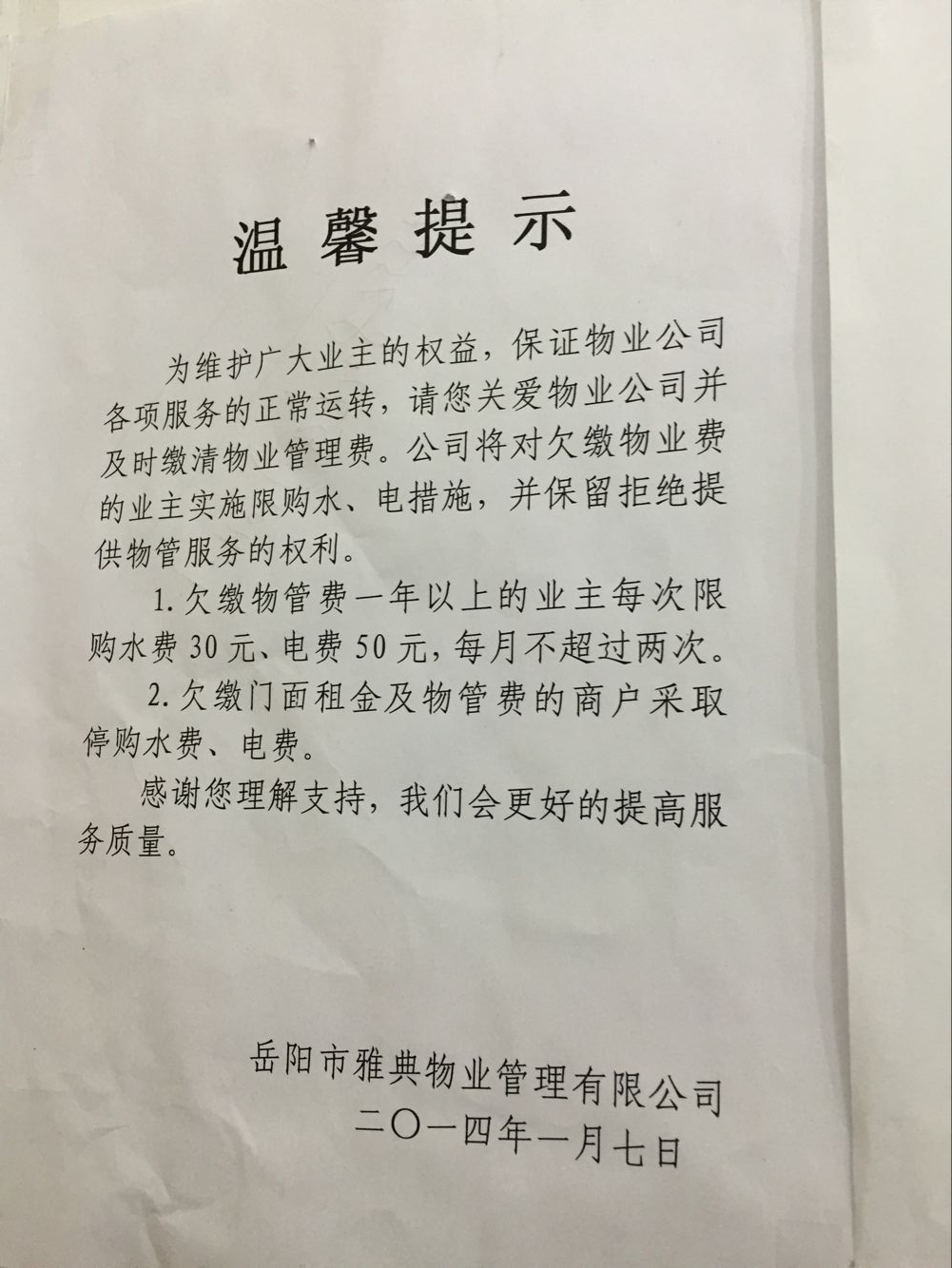 鉴于以上,有些业主以拒交物业费维权。2016年初,当我们再去物业公司购买水、电费时,物业公司工作人员以我们欠缴一年物业费为由,限制我们购水购电,只允许我们一次购买30元水电和50元电费,而且一月只准购买一次;对欠缴二年以上无业费的,不允许购买水电费。由于雅典新城的水电费只能到物业公司购买,这一规定严重影响了我们的基本生活权利,将直接导致我们今后无法居住。面对这样一个无视业主权利的“霸道物业公司”,我们广大业主恳求市长作主,还我们一个公道: