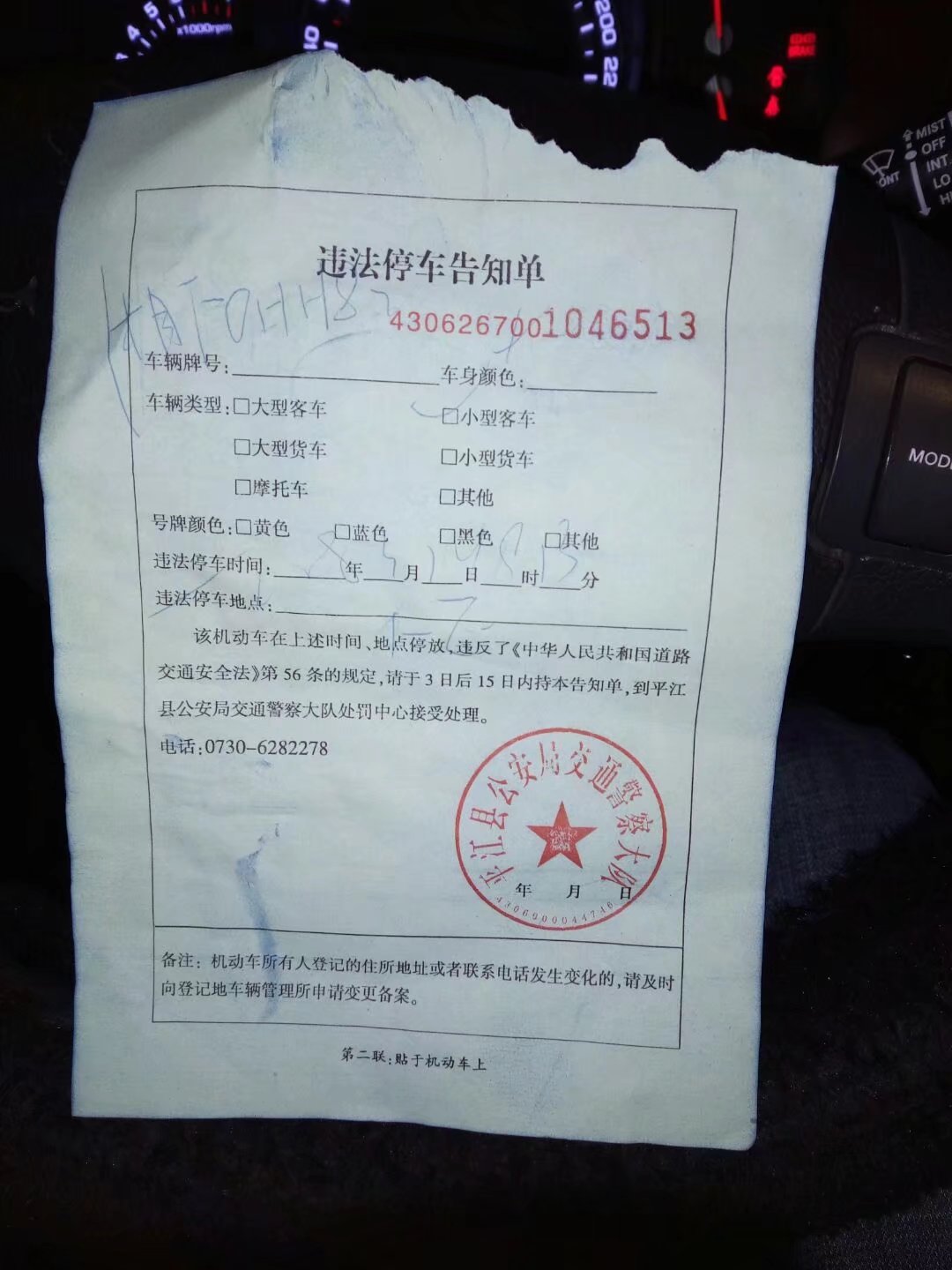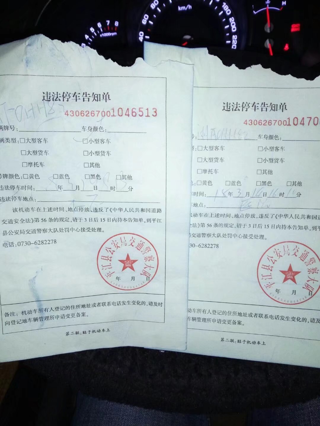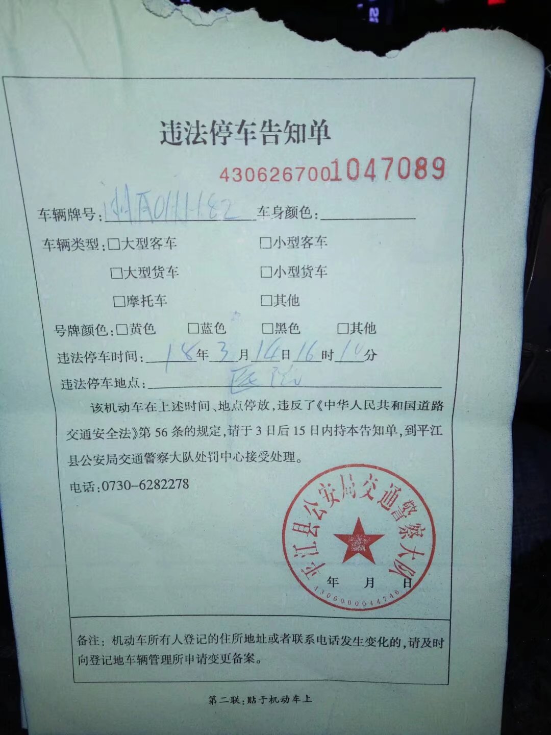 2018年3月14日,因为病人病情比较特殊在平江县第一人民医院转了几圈后实在是找不到停车地点(几个停车场车位已满),当时旁边有执勤的交警就将车子停在不妨碍交通的位置当时执勤的交警也看见了并没有对我进行劝导阻止。回到车上时发现几个小时内开具了两张违法停车告知单,第一根据相关法律规定24小时以内同一地点同一违法行为不能处罚两次,而两张违法停车告知单中间的间隔只有几个小时。第二相关法律规定开具的违法停车告知单必须对车辆的车牌,车辆的颜色,车辆的类型,违法时间,违法地点都有详细的记录。两张违法停车告知单落款的时间都没有,而违法地点第一张恕本人文化低我根本开不出来违法地点是哪里,第二张开的是医院,平江这么多医院请问是哪个医院?我就请问平江县交警大队你们的违法停车告知单到底是开给车主看的还是开给你们自己看的?字迹潦草不说为什么好多该你们告知的东西没有告知在你们眼里盖了平江县交警大队红章的东西就是这样开的?望相关部门能够给个满意的答复,谢谢!