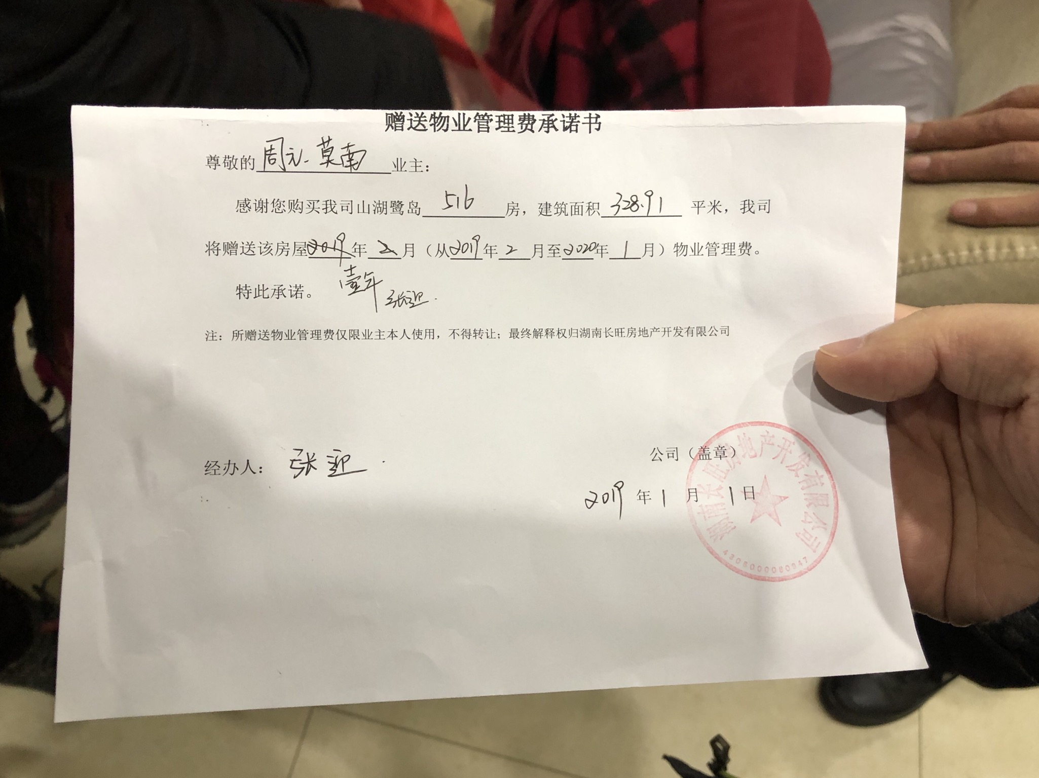 今天收房时该公司售楼人员依然承认并开具了《赠送物业管理费承诺书》,承诺书上明确写明赠送2019年2月至2020年1月的物业管理费。但物业公司蛮横无理,声称与售楼部财务分开,物业费收取由物业公司说了算,第一年物业费必须缴纳否则别想收房。对于物业突然强行要求缴纳费用的举措该公司拿不出任何文字、图片证明材料,事先未告知任何业主,态度极其蛮横霸道,l f