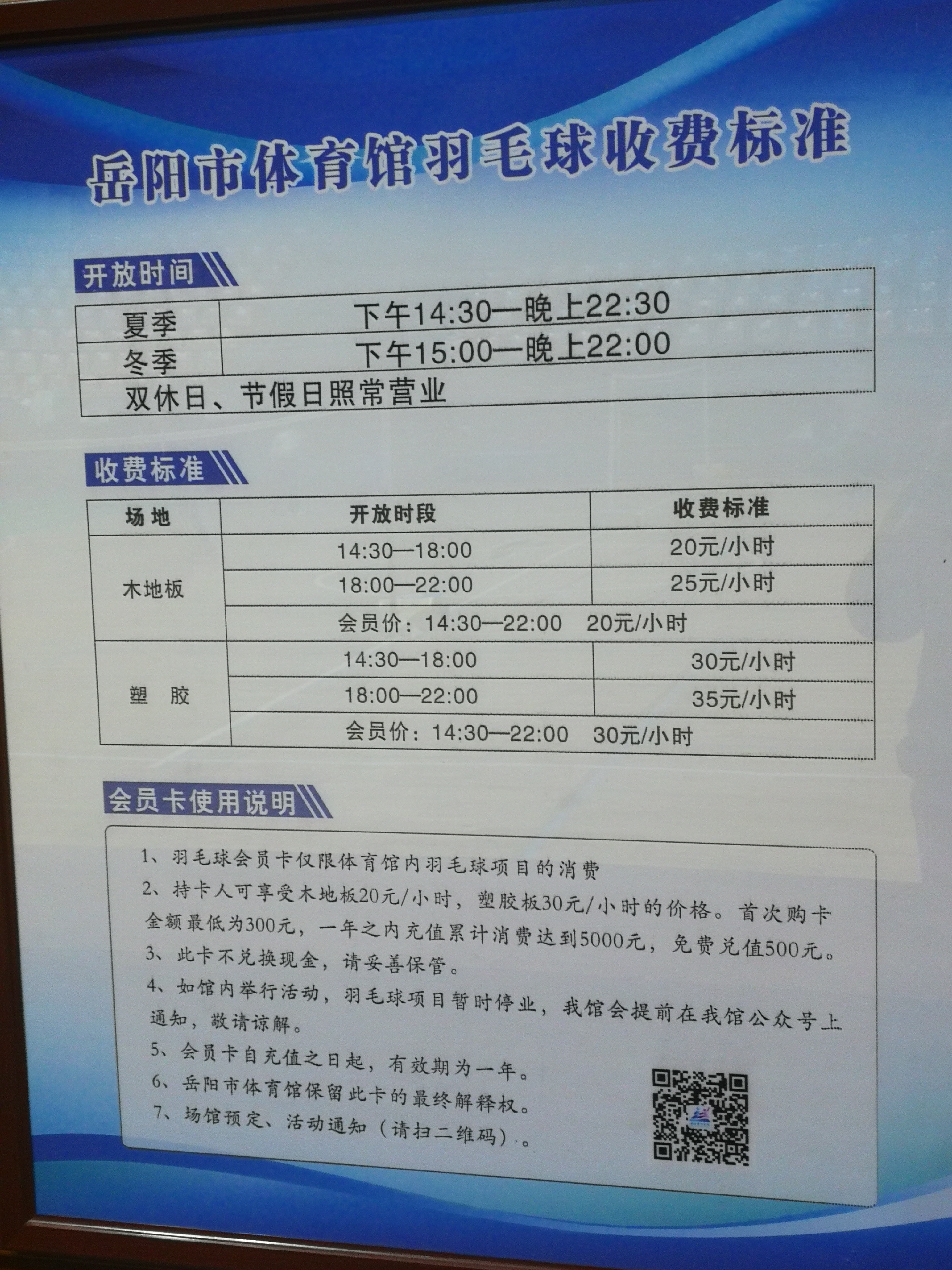 岳阳市体育馆外张贴了一张针对内场羽毛球场的“免费低收费开放方案”,上面写的是7、8台常年18:00-19:00免费,5-8台常年低收费,并且还有场馆预定的二维码,扫码显示进行预定场地操作。但内场又张贴了一张收费标准,上面写的又是每个场地都是收费的,分时段不同,电话咨询也答复说没有免费场地,并且不接受预订。