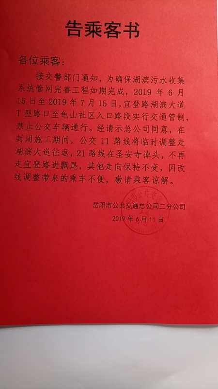 希望您在百忙之中看看这封信,我昨天看到这篇告知书,非常吃惊,不知道公交公司做这个决定的时候有没有考虑岳阳中学、黄沙湾社区、飘尾附近的数千居民的出行问题和学生上学放学出行问题,你们让他们怎么办?应该在作出这个决定时应该有后续措施保障市民的出行和孩子们上学放学便利,一则通知,就不管不顾了,这是典型不作为!公交公司的领导们,你们也要换位思考一下,公交事业本来就是服务广大市民的,而不是给市民添堵的。希望领导们能帮助解决岳阳中学、党校、飘尾附近居民出行方便,特别是学生马上就要期末考试了,为了孩子的安全,恳求市领导尽快解决,公交公司这种做法极不负责任的,政府整治污水处理工程是利民的好事,但是也要顾忌市民出行便利呀!起码要有相应的措施,不能说停就停,那些读书的孩子们怎么办?市民出行怎么办?15日马上就到了,希望领导们早日拿出一个方案,保障市民和孩子们出行便利,谢谢!
