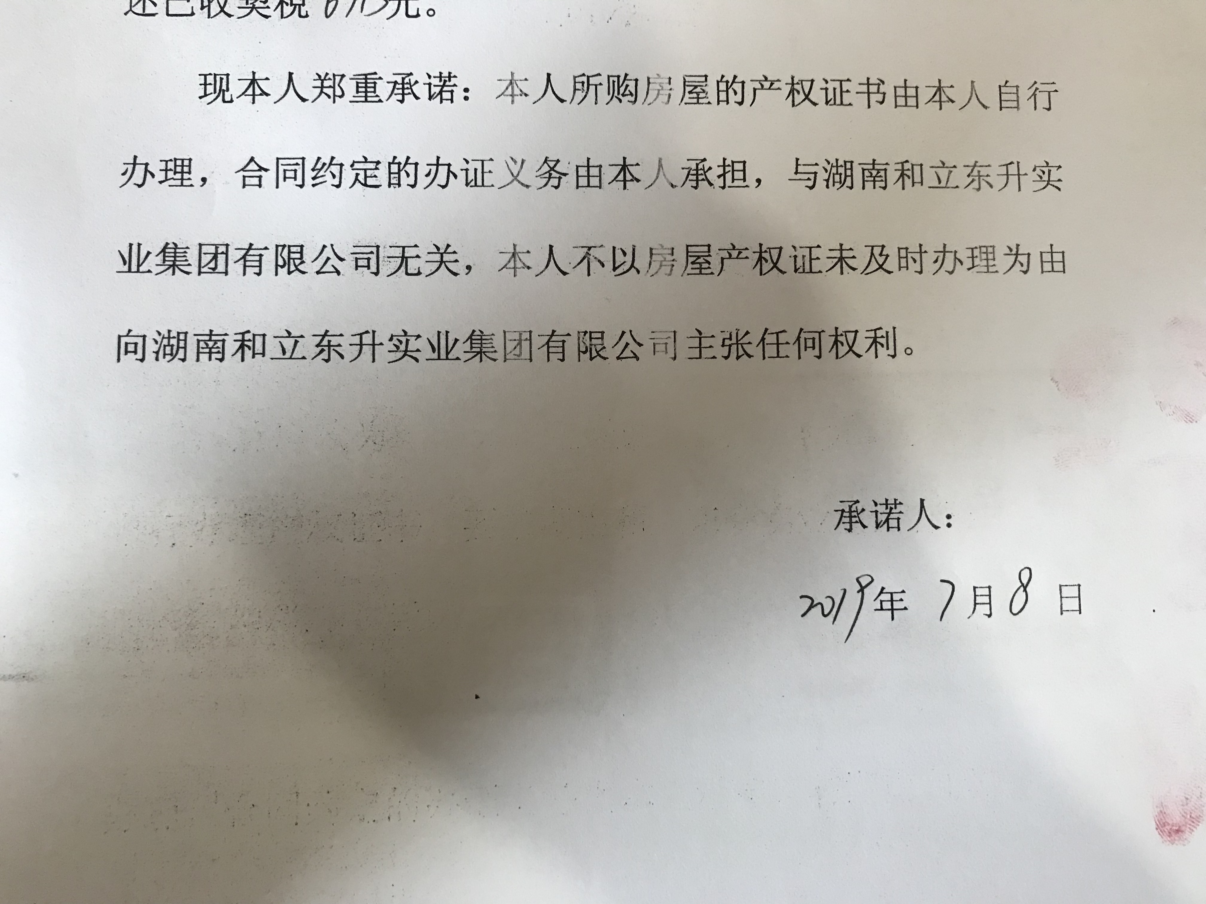 经开区税务局与业主佘先生联系,根据佘先生反映,开发商在代办证环节代收契税,但一直未缴纳,现佘先生要求退还契税,开发商也同意退还,但要求业主签订承诺,佘先生对其中条款有异议“本人不以房屋产权证未及时办理为由向湖南和立东升实业集团有限公司主张任何权利”,不同意签订承诺。
