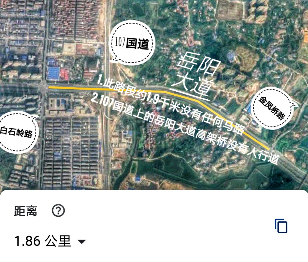 4.107国道上的岳阳大道高架桥上没有人行道,附近居民出行时只能在马路上行走,存在安全隐患。