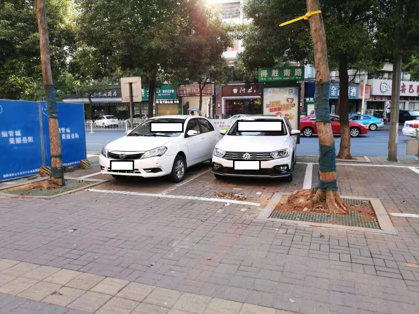 本人看到红绿灯处的西南角的岳阳大道西,施工单位画的车位(见附图005、007、004),在树与树之间,将原来有的二个蓝色停车位废除,用白色涂料重新只画了一个车位,但附图004停二台车宽度还有富余。而再在此地交汇处向北转90度走约7米左右,看到在得胜南路方向画的停车位,同一帮人同一时期施工的,在树与树之间画了二个停车位(附图中002、006、009),停二台车宽度也还有富余。