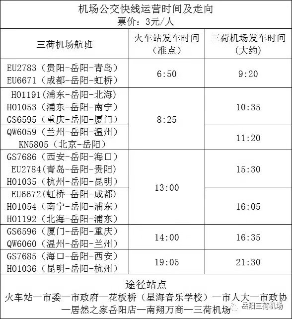 你好,因本人未在互联网上搜索到准确的岳阳三荷机场快线运行时刻表,还请协助提供一份目前现行的时刻表。具体需要火车站-三荷机场往返的,如发车无具体时刻,也请提供几点开始运行,间隔多长时间一趟,谢谢!