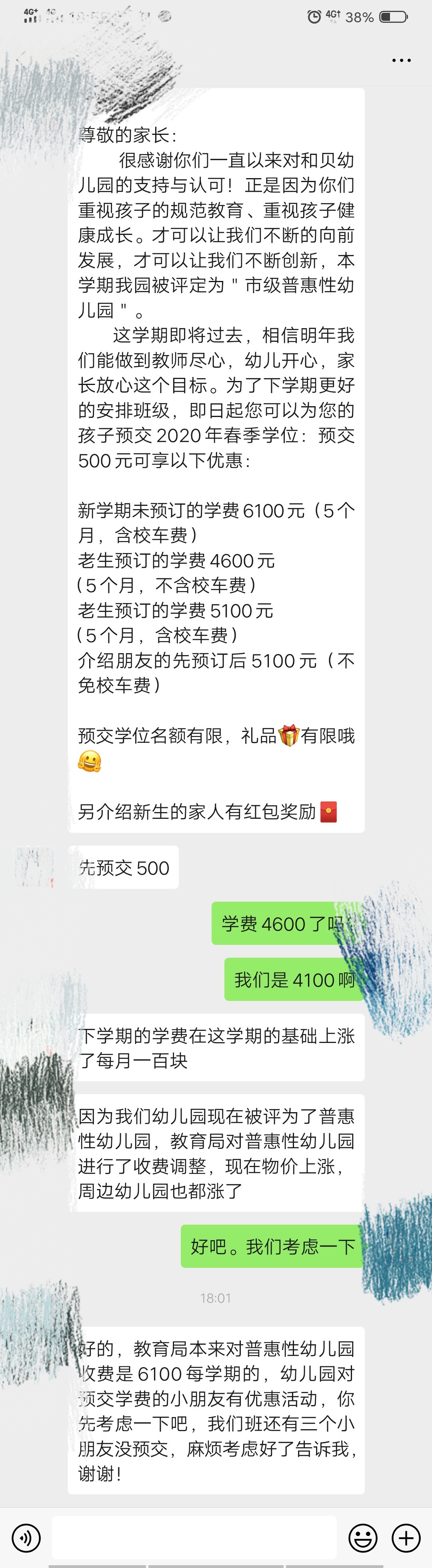 您好,我的小孩今年9月份就读于岳阳市八字门黎家垅路6号白象食品对面(和贝情境幼儿园),今年9月份入园时学费4100元/学期(不包含车费)一学期为5个月。本月接到老师通知预交下学期学费,4600元/学期(不包含车费),就学费上涨500元/学期,和幼儿园老师以及幼儿园负责人沟通,幼儿园给出回复,该幼儿园被评为普惠性幼儿园,教育局本来对普惠性幼儿园收费是6100每学期。疑问:普惠性幼儿园不是应该更加优惠吗?为何学费还会涨?在教育局公布的2018年至2020年普惠性幼儿园评比里面也没有看到和贝情境幼儿园。请问这样的涨价合理吗?不合理该怎么制止?