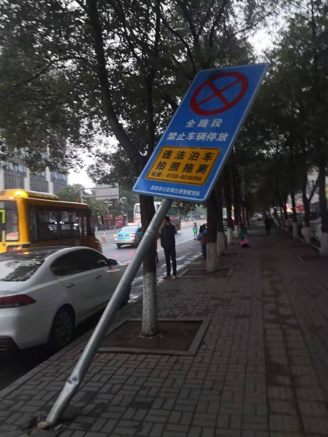 经济技术开发区通海路管理处八字门社区公交站台交通指示牌铁管严重倾斜,有重大安全隐患,望有关部门关注,予以解决。
