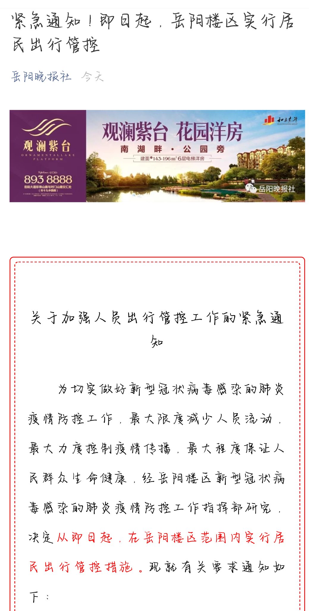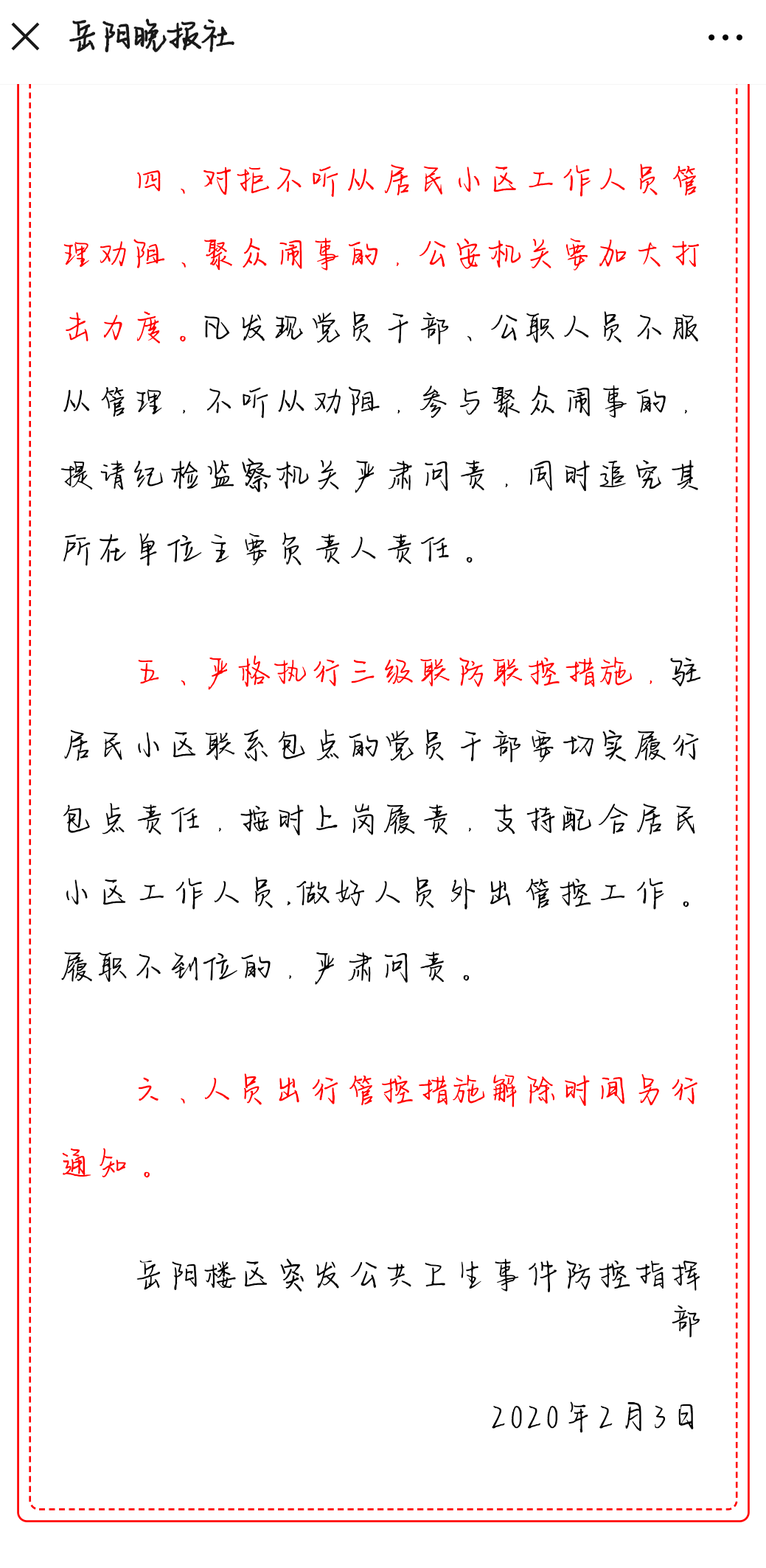 据悉,岳阳市岳阳楼区突发公共卫生事件防控指挥部2月3日通过“岳阳晚报社”媒体公众号发布《关于加强人员出行管控工作的紧急通知》。