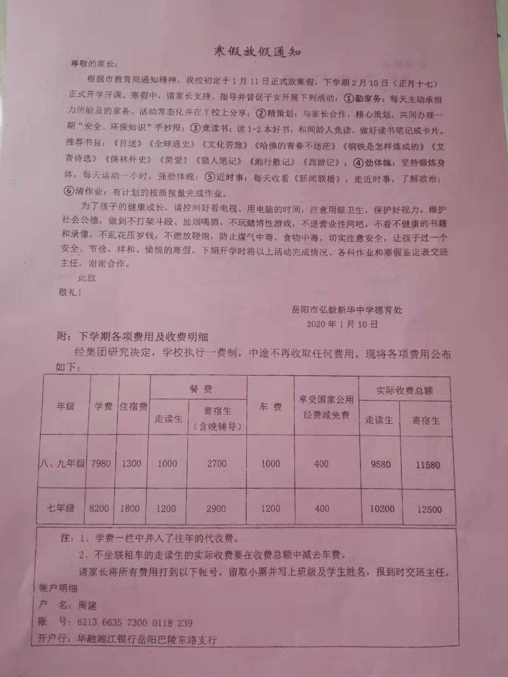 2、车费、伙食费、住宿费等费用的问题。根据有关文件精神,车费等费用属于其他收费,应由学校实施按月退费。因本期延期开学,待确定具体开学时间后,弘毅新华中学将按实际天数计算车费、伙食费、住宿费等费用。