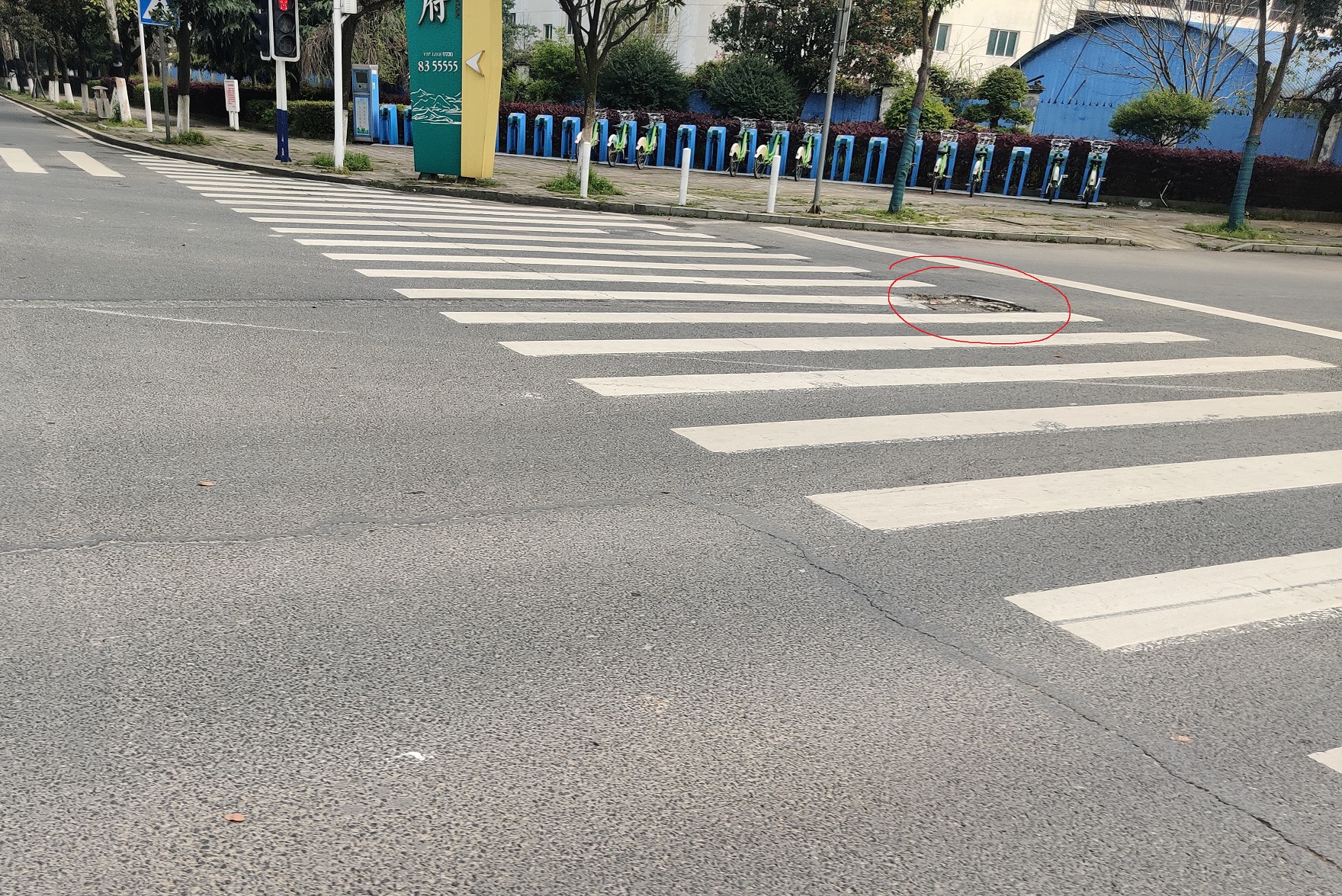 市区内东茅岭路东往西经过南湖大道的红绿灯口斑马线处也有一个类似的井盖塌陷多年,也是无人修复。请有关部门加强对路面破损情况的查勘,尽快对危险路面进行修缮!!