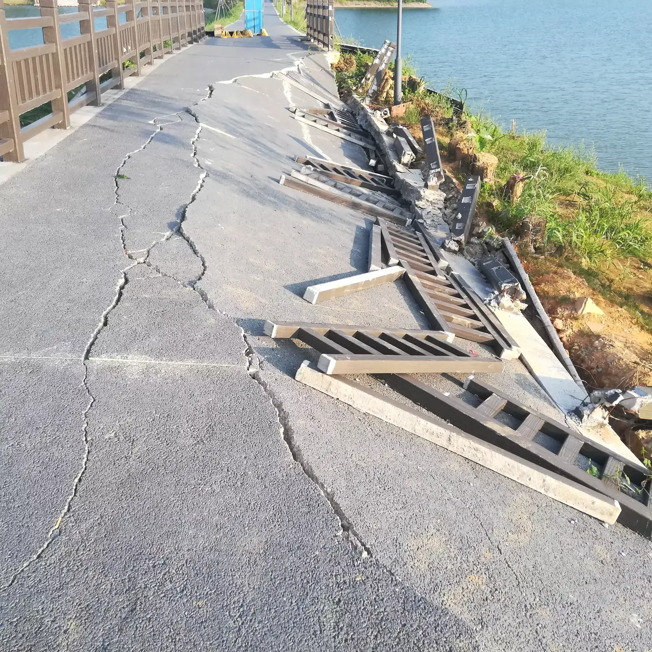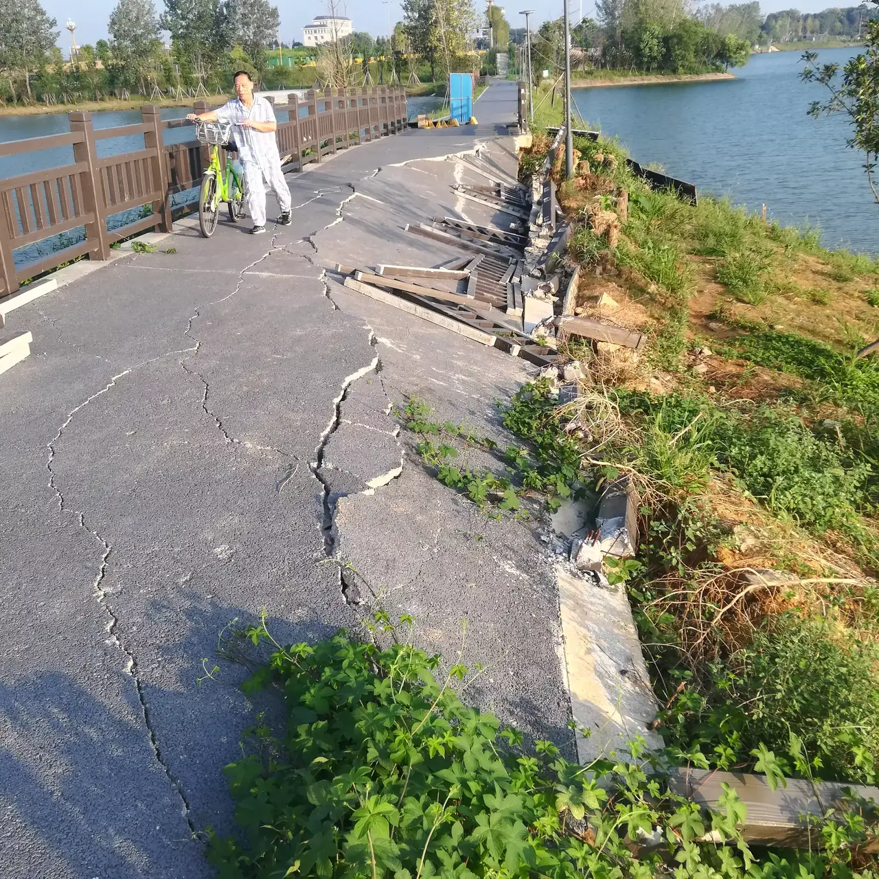 东风湖中湖至下湖连接处的桥堤,其塌陷原因为湖体地基沉降导致路面出现塌陷。目前我司正在积极整改,公司项目部正在对修复路段的图纸和方案进行审核、对维修路段的施工单位进行招标,东风湖运营管理公司也已对接施工标段,采用钢管加固桥梁围挡,拉起警告横幅,尽量避免游客进入塌陷桥梁范围。
