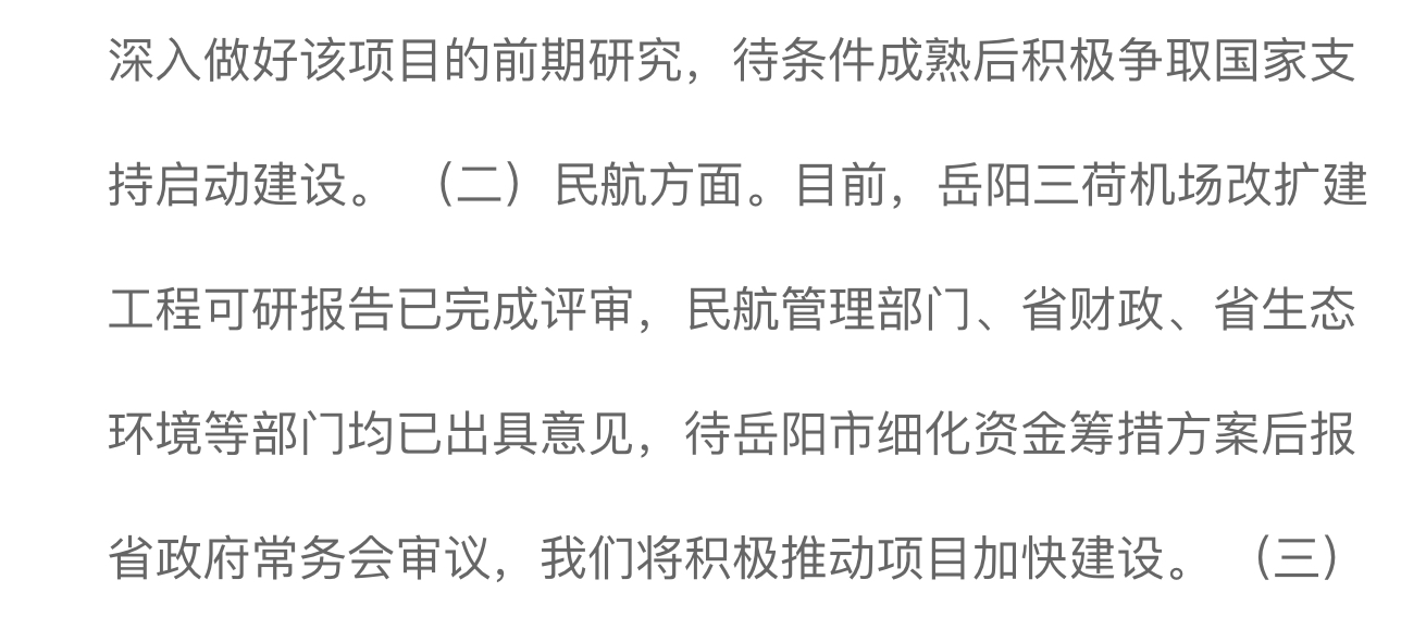 机场改扩建项目自启动以来,得到了省市两级政府的大力支持,目前已列入省市重点项目。由于民航项目的复杂性,三荷机场改扩建项目正处于可研批复阶段,项目正式开工前要历经初步设计与审查、施工图审查和清单编制、施工招投标等环节,还需同步完成国土报批报建、土地征拆等工作。我们正按照既定部署,强抓机遇,积极与国家部委及省直相关部门密切对接,加快推进项目进度,力争早日开工建设。
