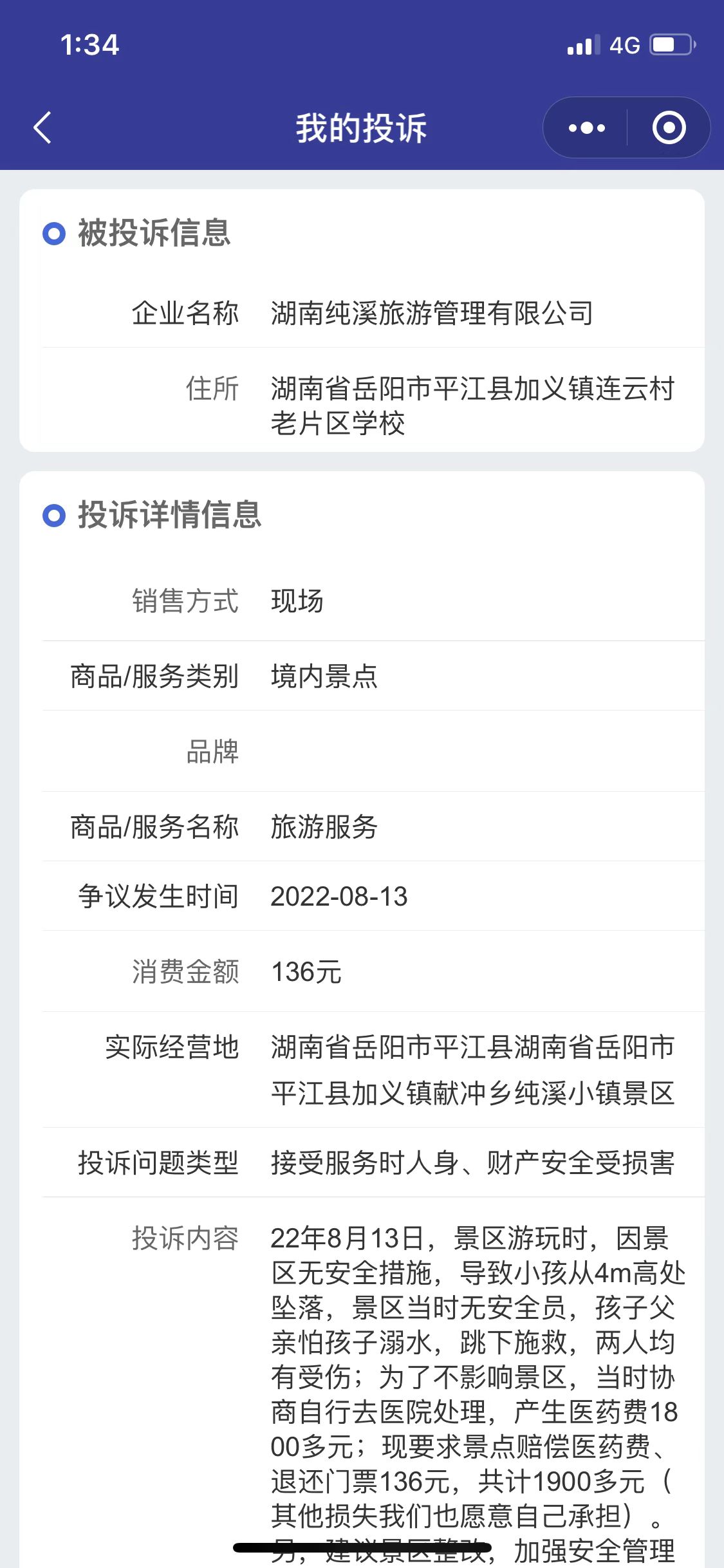 您好,2022年8月13日,我们一家三口去岳阳纯溪小镇游玩,小孩根据景区政策不满1m免票,花费136元门票费用进入景区游玩(景区未有任何告知:保险收费情况且通过私人微信收取门票费用),游玩过程中因为景区安全漏洞,致使我爱人和小孩受伤产生1800元左右的医药费用,我们协商景区要求他们明确愿意承担的医药费用具体数额,景区一直回避回复具体费用;后寻求12315投诉,景区仍不正面回复赔付金额,加义镇市场监督局也认可景区的行为,说我们投诉无理,不提供医药费发票,导致景区没有办法申请保险赔付(但是我们8月底已经邮寄了发票的明细告知了景区,景区也收到了,依旧无法告知我们赔付金额)。然后我们又第二次12315网上投诉,并说明了我们的理由,市场监督局没有再联系我们直接完成了协调。