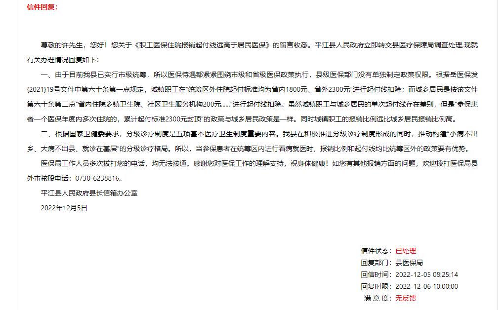 尊敬的许先生,您好!您关于《职工医保住院报销起付线远高于居民医保》的留言收悉,岳阳市人民政府12345热线服务中心将来信转交至平江县人民政府,平江县人民政府立即转交县医疗保障局调查处理,现就有关办理情况回复如下: