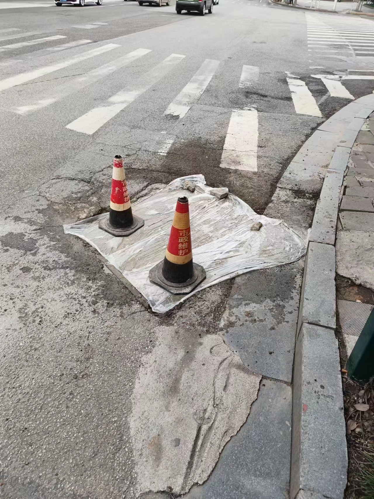 尊敬的岳阳市城市管理工作单位,岳阳青年中路与白杨坡交叉路口左手边有一个井盖凹进去了,这是2023年元旦之前拍摄的。希望年2023年初七上班以后看到了就第一时间做好补好井盖的准备。 如果有机会就会去查看一下,是否按照我的要求补好这个道路。