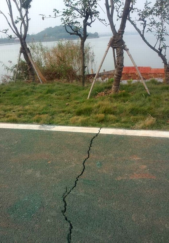 竣工应该还不到三个月吧? 湖滨圣安寺附近的彩色沥青路怎么就开裂破损成那样了!(别跟我们说这是大卡车压的哦)