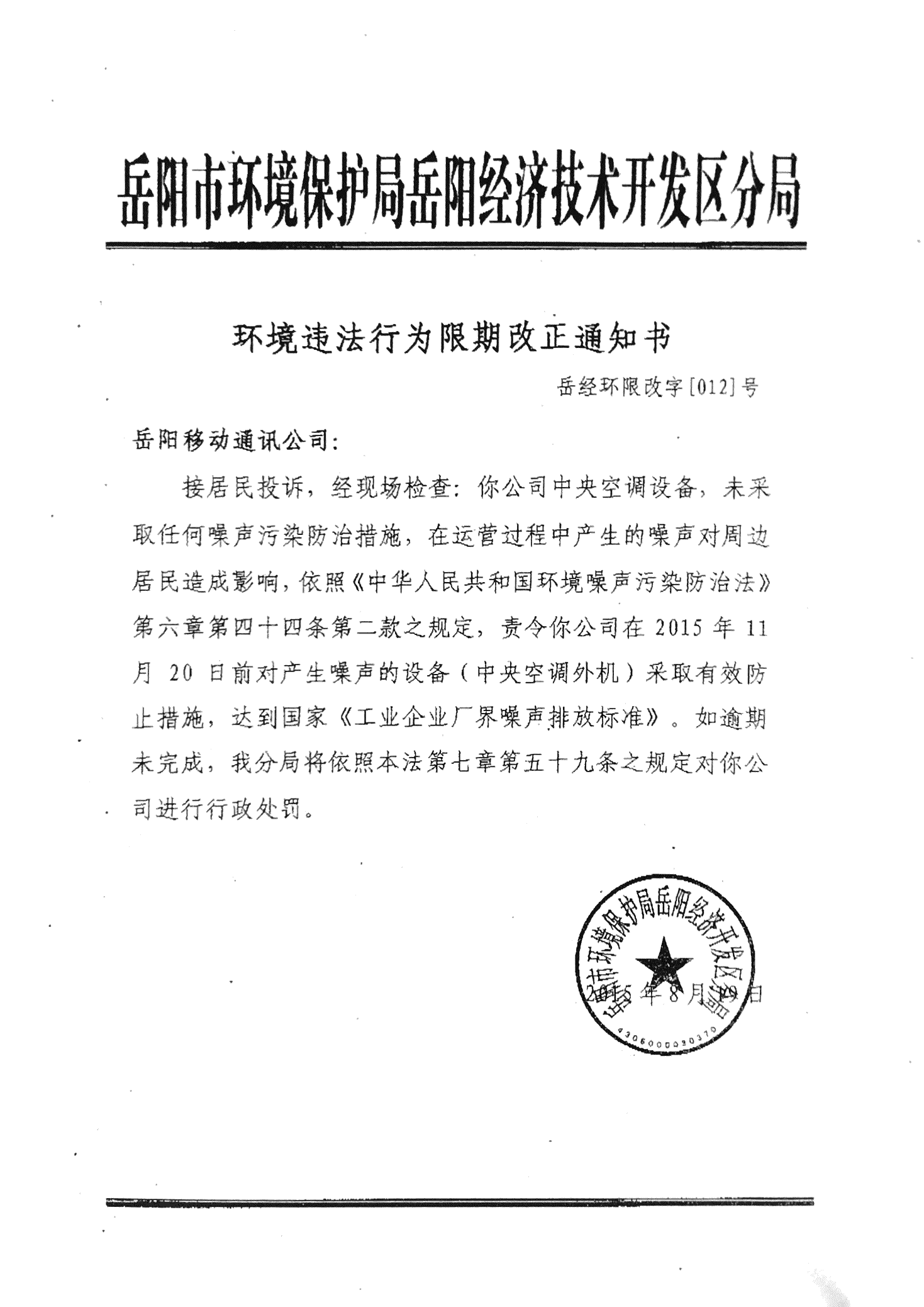 您好!您在市长信箱反映的关于移动公司空调楼顶噪声扰民问题我局已收悉。根据属地管理、逐级处访的原则,我局立即将该件转交开发区分局进行办理,开发区环保分局按照要求迅速落实,立即指派监察人员到现场调查处理,现将办理情况回复如下: