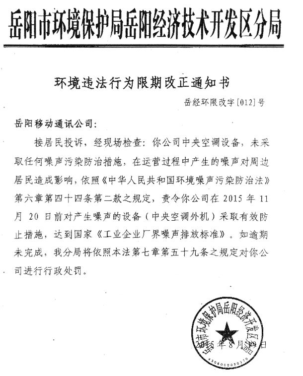 经查,英伦世家对面移动公司中央空调未采取任何噪声污染防治措施,在运营过程中产生的噪音影响周边居民属实。为此,经开区环保分局环境监察大队对移动公司当场下达现场监察文书,要求其迅速采取隔音降噪措施,并向该公司送达了《环境违法行为限期改正通知书》,责令该公司对产生噪声的设备采取隔音降噪防治措施,达到国家《工业企业厂界噪声排放标准》的要求。该公司正在积极向总公司申报进行整改,经开区环保分局将加强监督,确保整改落实到位。| 回复部门: | 市环保局 |