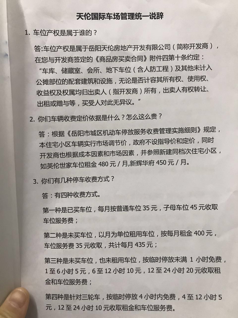 收费是否因本着双方自愿的原则, 现在全小区业主没有人同意这样的收费,就是在一线城市深圳,月租停车费的费用基本都是在200元,而天伦国际对于本小区业主实行400元每月的月租费,还要加35的车位管理费,不知道天伦国际是如何想当然在这里胡乱收费,是否通过了物价部门的审批?能否还我们一个正常的三线城市的合理定价?