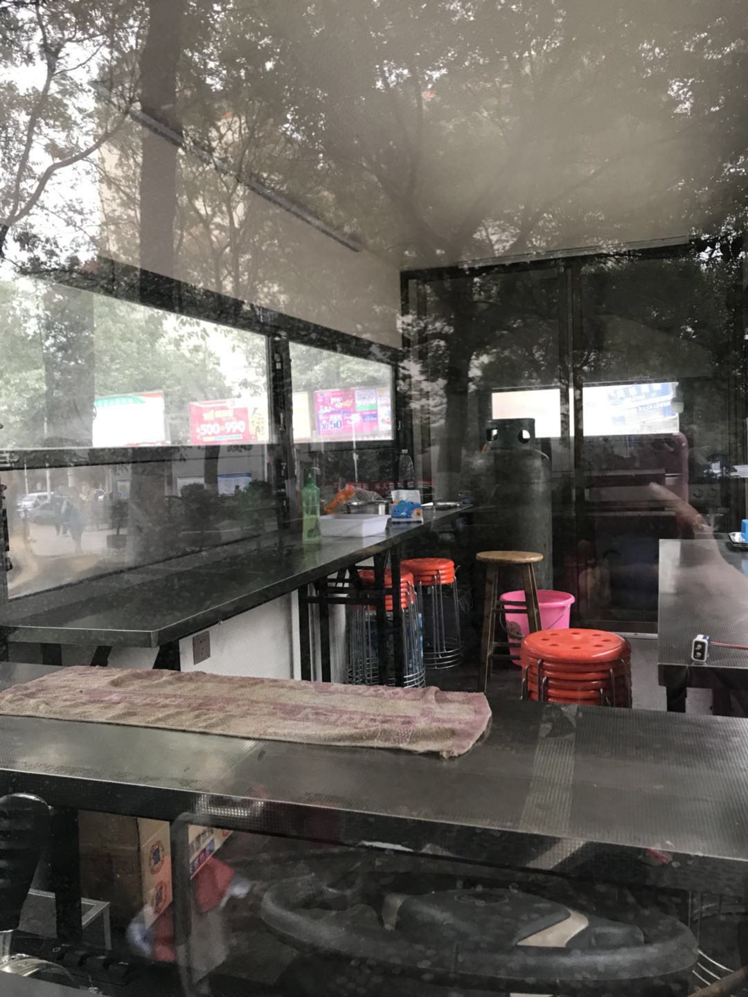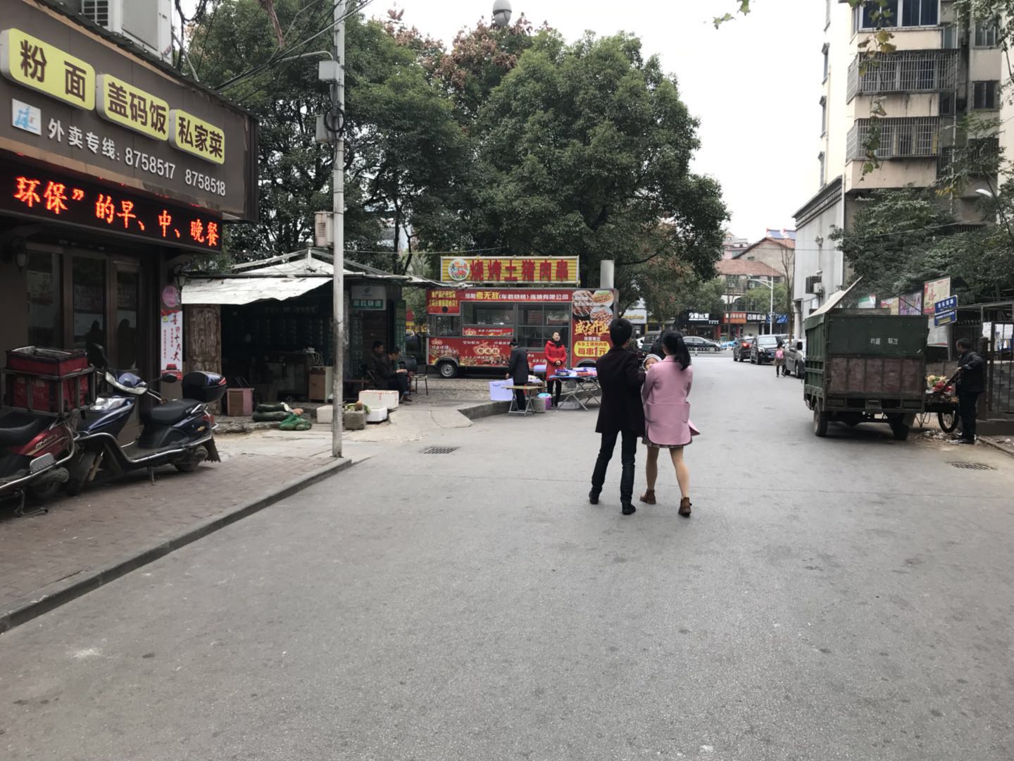 2017年11月10日早晨,位于岳阳大道与民乐苑路相交的桃花山社区门口,一辆流动烧烤车违章停在人行道上,车主白天违章停车,夜间占道经营。